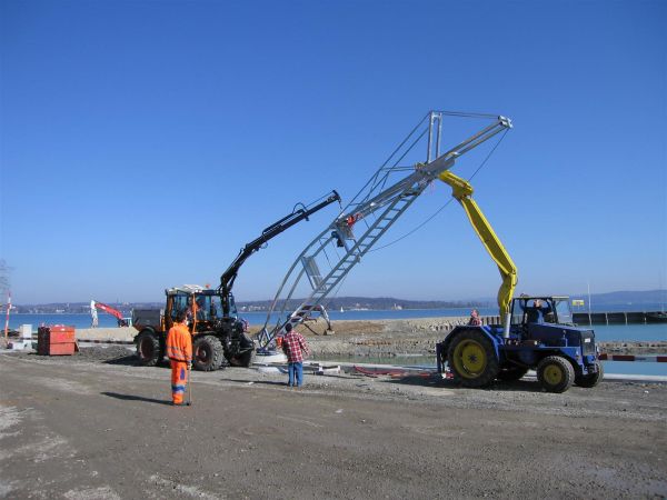 Gemeinsam wird der Kran aufgestellt