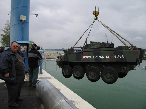 Abnahme des versetzten Hafenkrans mit einem 16 t Piranha der Fa. MOWAG