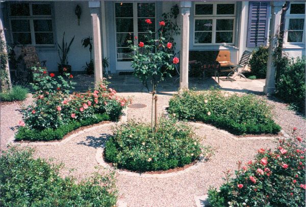 Von Buchs eingefasste Rosenbeete auf der Südseite des Mühle-Wohnhauses